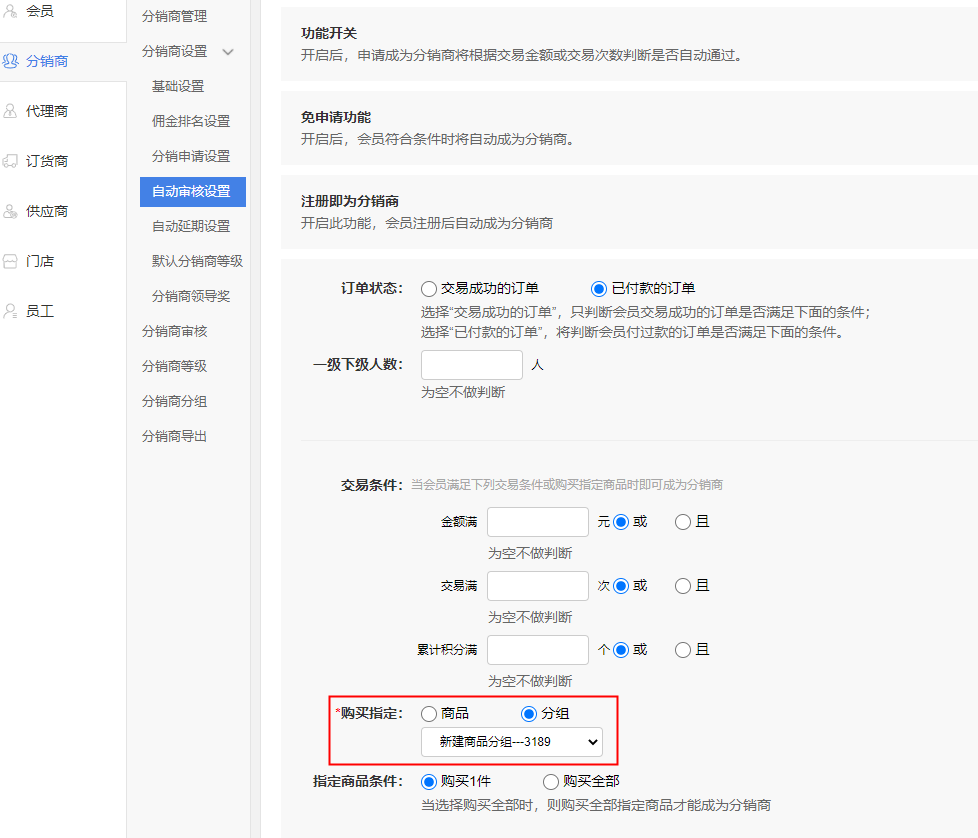 現(xiàn)邏輯:會員--分銷商--自動審核設(shè)置,自動審核商品增加“商品分組”設(shè)置