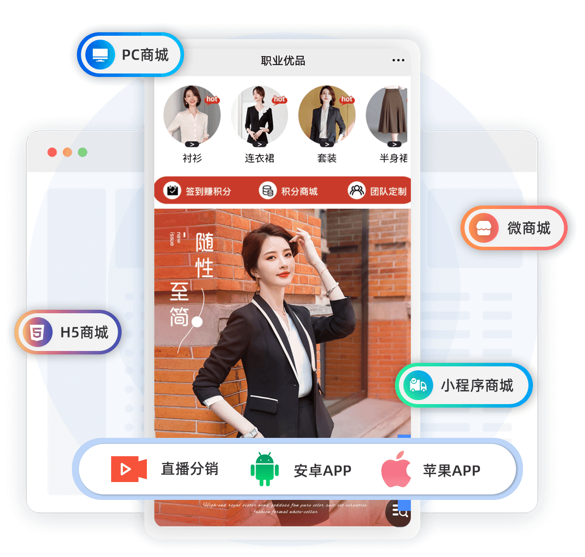 7大線上渠道,全線引流PC商城、微商城、小程序商城、H5商城、蘋果安卓APP商城、直播商