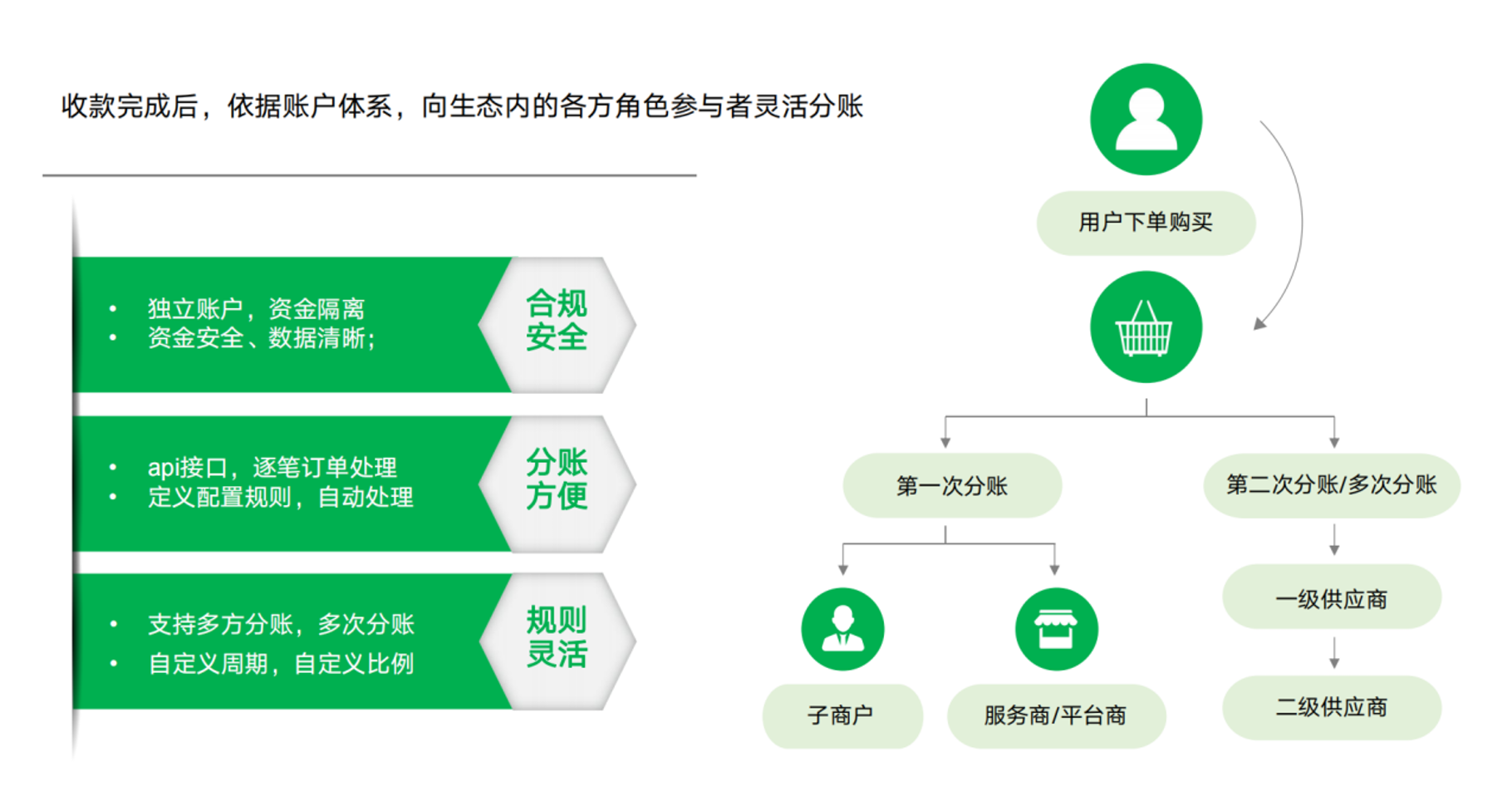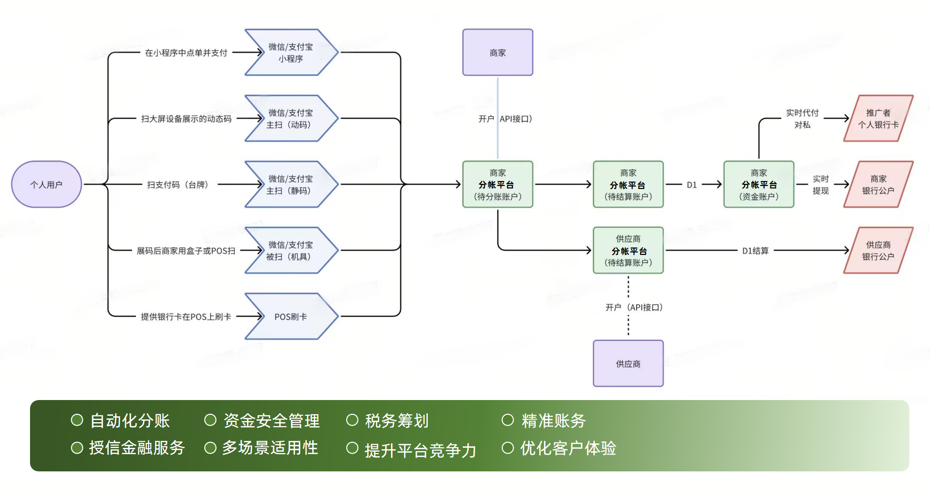 通過靈活的分賬清算和實(shí)時(shí)分賬功能,為企業(yè)提供高效的多商戶入賬解決方案,優(yōu)化資金流轉(zhuǎn),降低運(yùn)營(yíng)成本,增強(qiáng)合作伙伴間的財(cái)務(wù)協(xié)作效率,助力企業(yè)實(shí)現(xiàn)更精細(xì)的資金管理和業(yè)務(wù)擴(kuò)展。