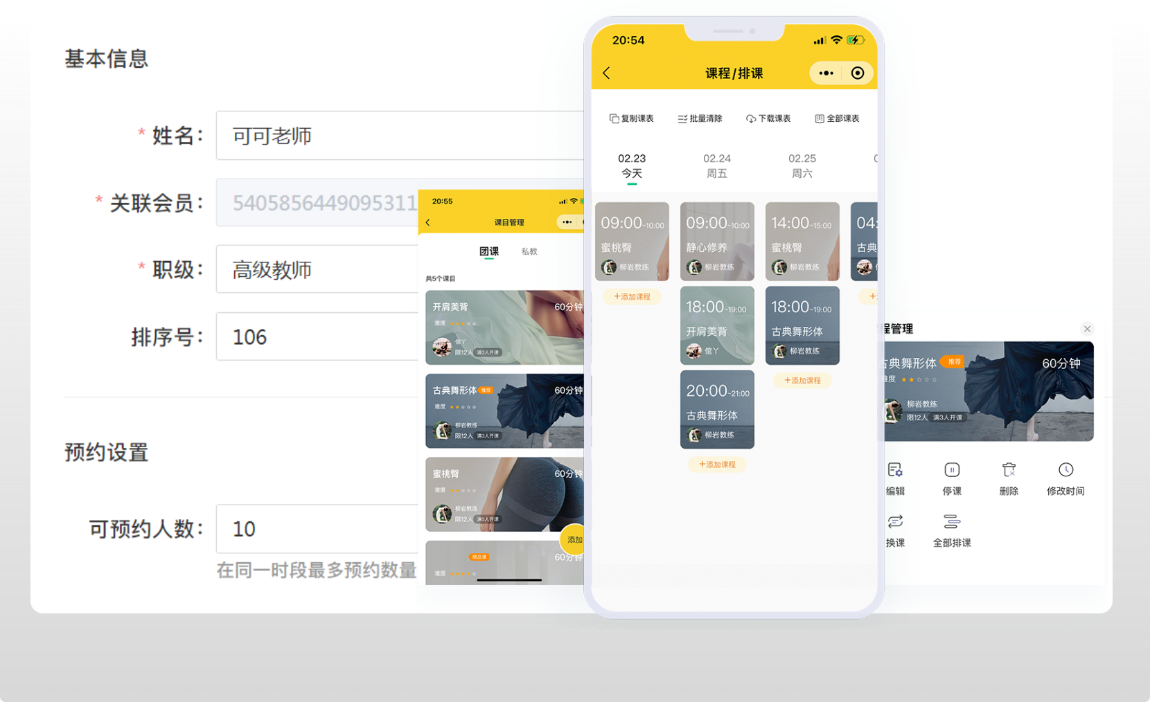 依托微信公眾號以及微信小程序,會員使用更方便,會員卡、次卡、權益卡,儲值卡等多種營銷工具,幫助商家更好的管理會員;課程預約、老師安排應有盡有。